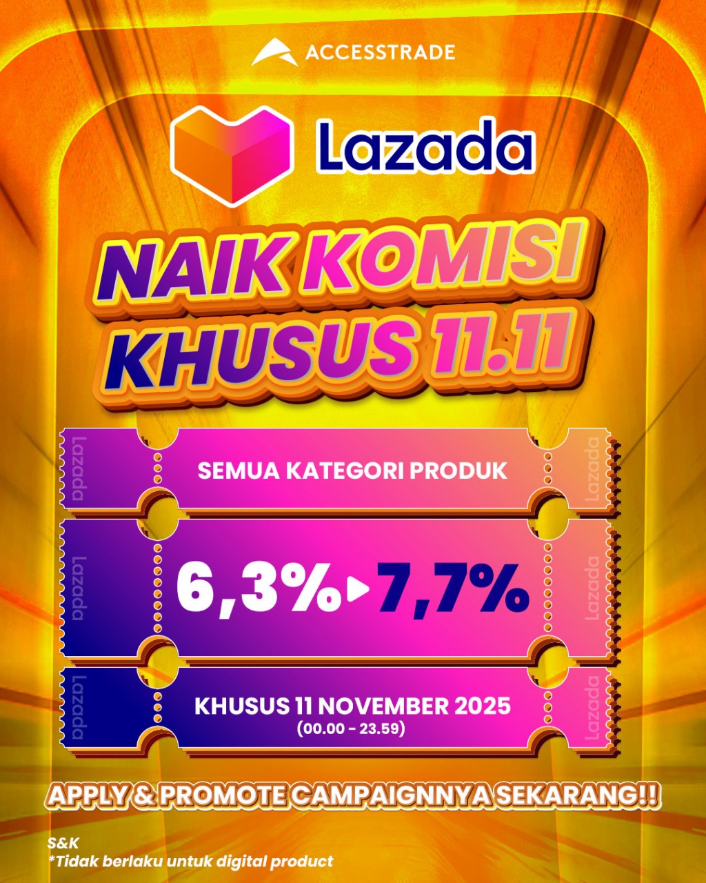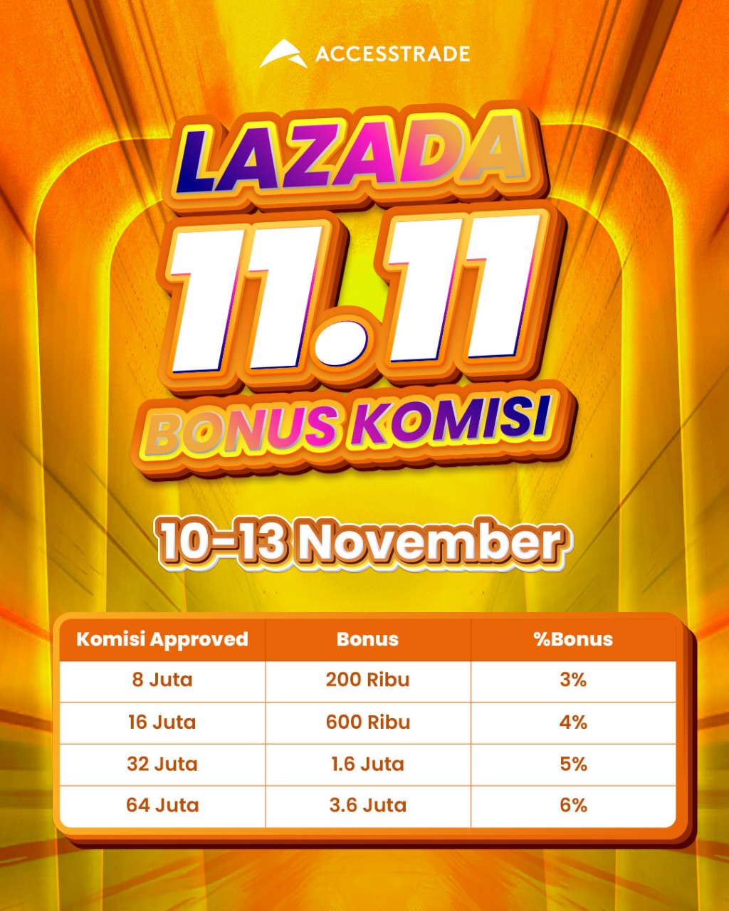 Dalam rangka menyambut festival belanja 11.11, Lazada tidak hanya memberikan upsize komisi hingga 7.7%, tetapi juga menghadirkan bonus tambahan bagi para publisher yang mencapai target tertentu selama periode 10–13 November. Program ini memberikan penghargaan khusus bagi publisher dengan performa terbaik selama periode promo berlangsung!