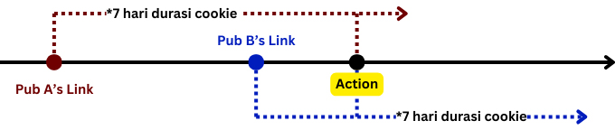 Konsep One Click Action dan Model Last Click Attribution adalah kondisi di mana komisi akan diberikan kepada publisher yang link afiliasinya terakhir kali diklik oleh pengguna sebelum mereka menyelesaikan pembelian.