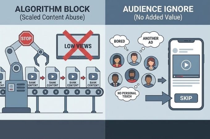 Banyak publisher bertanya kepada diri sendiri mengapa video mereka tetap sepi penonton meskipun produk yang dipromosikan sedang tren. Penyebab utamanya adalah algoritma yang mendeteksi adanya Scaled Content Abuse atau penyalahgunaan konten massal. Saat sistem mengenali bahwa sebuah file video memiliki metadata dan struktur visual yang identik dengan ribuan video lain, sistem tersebut akan membatasi distribusinya. Hal ini dilakukan untuk menjaga agar halaman beranda pengguna tidak dipenuhi oleh konten yang sama secara berulang.