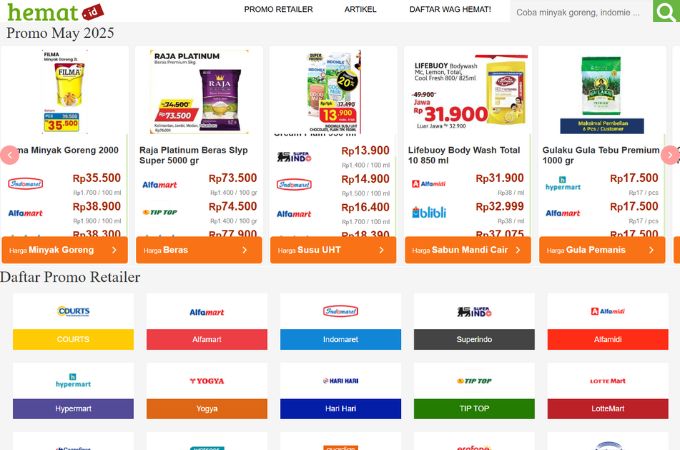• Dikelompokkan berdasarkan kategori atau retailer. Misalnya pada hemat.id, pengguna dapat memilih kategori Promo Makanan Resto (berisi promo KFC, McD, dll) atau Promo Retailer seperti Alfamart vs Indomaret. Pengelompokan ini memudahkan pengguna menyaring info sesuai minat (karena tidak semua orang tertarik pada semua jenis promo).