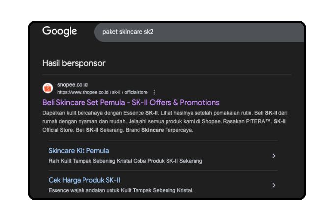 Pernah kamu mencari sesuatu di Google dan mendapati iklan bersponsor seperti gambar diatas? Ya, itu adalah contoh tampilan dari Search Ads, dimana Google akan menampilkan iklan berdasarkan kata kunci yang kamu cari di mesin pencarian.