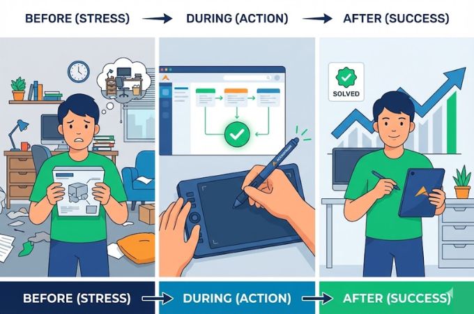 Foto yang kamu pilih sebaiknya terasa seperti potongan perjalanan: ada sebelum, proses, dan setelah. Bukan soal jumlah fotonya berapa, tapi bagaimana rangkaian visual tersebut membantu audiens memahami perubahan yang kamu alami atau hasil yang kamu capai berkat solusi yang kamu rekomendasikan.