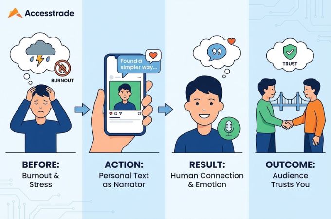 Dalam konteks affiliate, storytelling lewat desain membantu kamu terlihat lebih autentik, bukan sekadar promotor produk, menunjukkan pengalaman nyata, bukan klaim tanpa bukti, menyampaikan rekomendasi dengan cara yang lebih natural dan tidak memaksa.