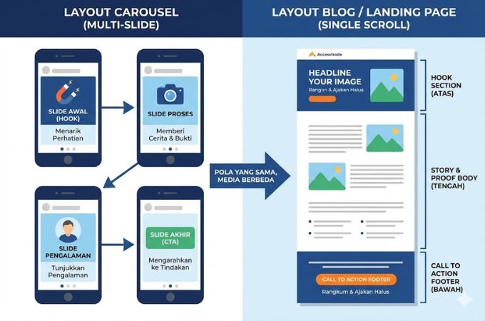 Layout yang efektif biasanya mengikuti alur: menarik perhatian dulu, memberi cerita atau bukti, lalu mengarahkan ke tindakan. Di carousel, misalnya, slide awal fokus ke hook cerita, beberapa slide berikutnya menunjukkan proses/pengalaman, dan slide terakhir merangkum manfaat plus ajakan halus (misalnya mengarahkan ke link). Di blog atau landing page, pola ini sama saja, hanya medianya yang berbeda.