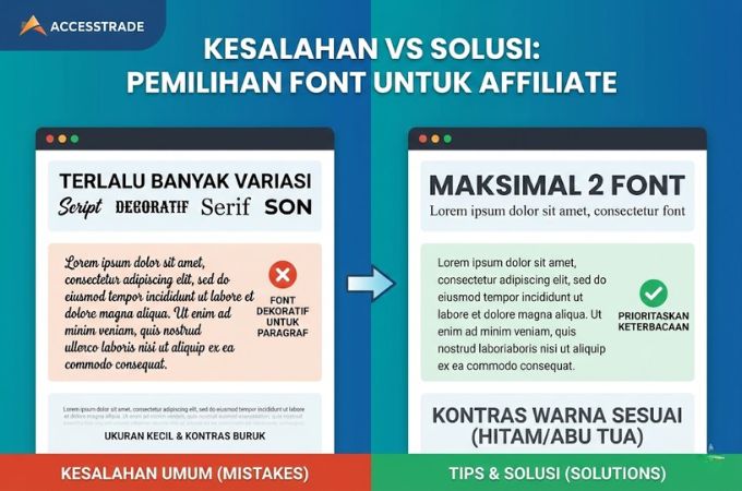 - Utamakan keterbacaan. Audiens affiliate cenderung melakukan scanning. Font yang terlalu tipis, dekoratif, atau rapat akan memperlambat pemahaman dan menurunkan potensi klik.