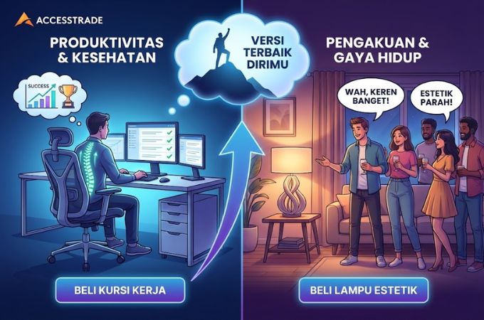 Orang tidak membeli kursi kerja; mereka membeli "produktivitas" dan "bebas sakit punggung". Mereka tidak membeli lampu estetik; mereka membeli "pengakuan" saat teman-teman mereka berkunjung ke rumah.