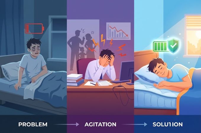 Perdalam rasa sakit tersebut. Buat mereka merasakan konsekuensinya jika masalah itu dibiarkan. Misal: "Kualitas tidur yang buruk bukan hanya soal kantung mata. Ini menghancurkan fokus kamu di kantor, membuat kamu mudah marah pada anak-anak, dan perlahan menggerogoti kesehatan jangka panjang kamu." (Target: Emosi takut/bersalah).