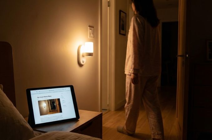 Tunjukkan gadget yang sedang digunakan di atas meja kayu yang estetik. Tunjukkan sprei atau sofa dalam tatanan ruangan yang hangat dengan pencahayaan alami.