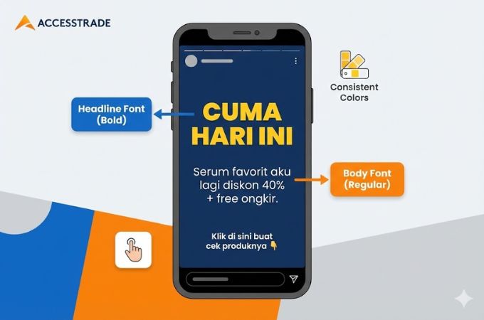 - Merah/kuning/oranye → untuk kata penting seperti “Diskon”, “Flash Sale”, “Terbatas”.