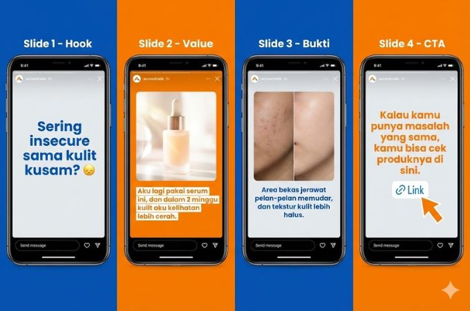 Dengan urutan seperti ini, kamu mengajak followers melewati alur logis: dari masalah → solusi → bukti → ajakan. Itu jauh lebih meyakinkan dibanding satu slide saja.